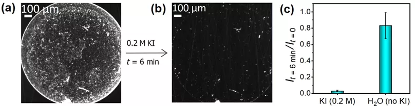 图2 (a)纳米颗粒被滴镀在电极的局部区域,在暗视野显微镜下的成像。(b)浸润在碘化钾溶液6分钟后的局部电极表面。(c)分别浸润在碘化钾溶液和纯水后,所剩纳米颗粒散射光强度的对比。