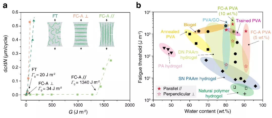 如图2所示,通过定量测量疲劳裂纹的拓展曲线,他们发现无退火处理的PVA水凝胶的疲劳阈值仅仅只有20 J m-2,约等于断裂一层无定形分子链,与传统化学交联的PVA水凝胶类似。当PVA水凝胶经过冷冻铸造和退火处理后,其疲劳阈值在垂直取向上为34 J m-2,而在平行取向上能够达到1340 J m-2。同时,提高PVA的水含量能实现疲劳阈值高达2740 J m-2。此外,该各向异性抗疲劳水凝胶的策略被证实可以应用于其他不同的材料体系,如多糖(藻酸盐、纤维素)、蛋白质(明胶)、合成聚合物(PVA)以及相应的聚合物复合材料。