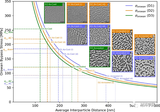 图10 A2相中的Orowan绕过应力与D1-D3合金中存在的所有形态类型的平均颗粒间距离的关系。A2相的剪切模量值是在900℃下计算的。图像中的比例尺为2 μm。
