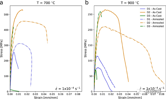图6 在700 ℃(a)和900 ℃(b)下测试的退火和铸态合金的代表性拉伸工程应力-应变曲线。注意,对于两个测试温度,不同的应力轴比例是必要的……
