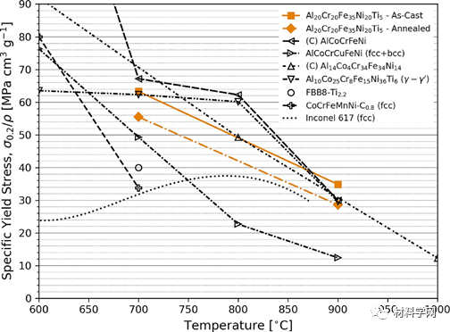 图11 D2合金(Al20Cr20Fe35Ni20Ti5)以及其他几种为高温应用而设计的HEA/CCAs、一种优化的铁基超合金和Inconel 617的特定屈服应力与温度的关系。