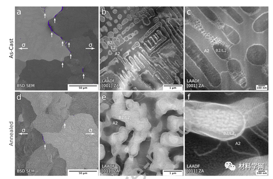 图4:第一行图像显示了铸态条件下D1-D3的STEM-EDS图的NMF-PCA分解载荷。量化的相组成(at.%)直接显示在有序(B2/L21)和无序(A2)相的图像中。三张图的比例一样。第二行图像显示相位结构和界面位错网络,使用低角度环形暗场(LAADF)探测器成像,该探测器显示原子序数和衍射对比度。所有三个图像的比例都是相同的。(d)中的插图暗场图像是用g1`11L21和g2`22L21扩散矢量从同一区域拍摄的。对于g1`11L21,超晶格APB的位置用白色箭头表示。(e)和(f)中的插图HAADF图像已经过傅里叶滤波以去除高频噪声,并且每个图像都显示了合金D2和D3中有序和无序相畴之间的单一界面……