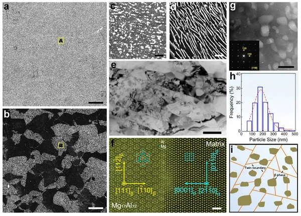 近日,金属所中科院核用材料与安全评价重点实验室许道奎研究员团队与南京工业大学信运昌教授课题组合作在制备高强高耐蚀镁合金材料方面取得重要进展。他们采用多道次三向压缩技术制备孪晶组织,通过对压缩路径及道次应变的独特设计,利用12道次低应变和高应变循环交替压缩,在AZ80镁合金中成功地制备出平均片层厚度约为200 nm的高密度孪晶组织,使平均晶粒尺寸从初始材料的33 mm左右细化至300 nm,其抗拉强度高达469 MPa,是已报道该系列镁合金中强度最高的。利用高密度超细孪晶组织细化晶粒,不仅避免了非平衡晶界对耐腐蚀性能的不利影响,而且改变了β-Mg17Al12相的形貌及分布。β-Mg17Al12析出相呈颗粒状,细小且均匀分布在镁基体中,显著抑制了局部腐蚀的发生,将腐蚀速率降低了一个数量级。该研究成果以“Evading strength-corrosion tradeoff in Mg alloys via dense ultrafine twins” 为题发表在《自然·通讯》(Nature Communications)上。