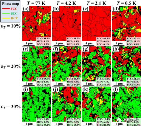 6)从断裂机理上解释了塑性异常,即4.2K和2.1K下的剪切带导致应变局部化和后续灾难性断裂。在77K和0.5K条件下,变形马氏体有效地缓解了应变局部化导致更高的延性。