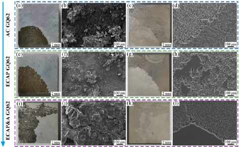 图13 (a-d)AC GQ62,(e-h)ECAP GQ62和(i-l)ECAP&A GQ62(a,b,e,f,i,j)的表面形貌和(c,d,g,h,k,l)没有腐蚀浸泡2小时后的样品。(a、c、e、g、i、k)光学图像和(b、d、f、h、j、l)SEM图像。