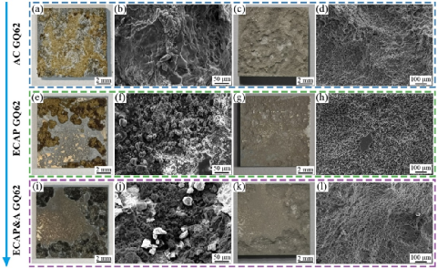 图14 (a-d)AC GQ62,(e-h)ECAP GQ62和(i-l)ECAP&A GQ62(a,b,e,f,i,j)的表面形貌和(c,d,g,h,k,l)无腐蚀浸泡24小时后的样品。(a、c、e、g、i、k)光学图像和(b、d、f、h、j、l)SEM图像。