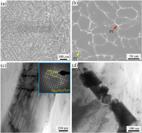 图1 AC GQ62的显微结构:(a,b)SEM图像和(c,d)BF-TEM图像(a,c)低倍率和(b,d)高倍率。