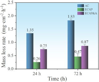 (3)电化学腐蚀、质量损失和析氢测量一致表明,ECAP GQ62的耐腐蚀性最好,其次是ECAP&A GQ62,而AC GQ62的耐腐蚀性最差。分层沉淀有助于长时间浸泡形成相对完整的腐蚀产物膜,但由于微电偶腐蚀,它们可以在一定程度上加速腐蚀,使ECAP&A GQ62具有比AC GQ62更好的防腐性能。这一发现为通过分层沉淀微观结构设计高强度、良好延展性和耐腐蚀镁合金打开了一扇新窗口。