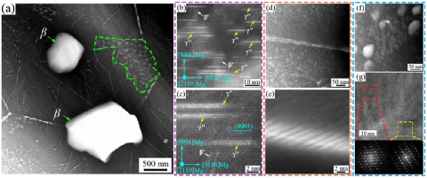 图5 ECAP&A GQ62析出物微观结构的HAADF-STEM图像:(a)低倍率。(b,c)晶粒内部析出物的高放大倍数。(d,e)晶界处析出物的高放大倍数。(f)晶界附近析出物的高放大倍数。图(f)中大颗粒和α-Mg的高分辨率TEM图像和FFT图像显示在图(g)中。