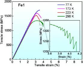 图3在不同温度下测试的Fe1的典型工程拉伸应力-应变曲线,插图显示了在298 K下测试的Fe1 UTS以外的锯齿。