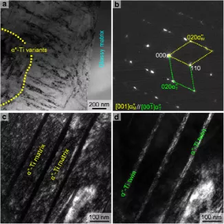 图8(a)α〃-Ti板在143k.(b)SAED模式下拉伸变形Fe0的TEM显微照片,显示了α〃-Ti孪晶的衍射模式。(c)和(d)α〃-Ti基体及其孪晶的暗场TEM显微照片。