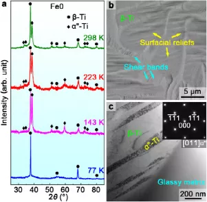 图5(a)显示了在四个试验温度下拉伸变形的Fe1的XRD扫描。与图1(b)中的铸态相比,四个拉伸变形的Fe1样品的XRD图谱非常相似。测量了{110}β峰的半高宽,如补充材料中的表S2所列,与铸态相比,{110}β峰的半高宽随变形而增加,并且只能注意到β-Ti峰的加宽。在四个拉伸变形的Fe1的XRD扫描中没有出现新的额外峰值,这表明Fe1中的β-Ti晶体在298 K到77 K的温度下通过位错滑动塑性变形。图5(b)显示了在298 K下变形的Fe1断裂表面附近区域的SEM背散射显微照片。可以看到几个变形带,它们连续穿透整个β-Ti树枝晶和局部玻璃状基体。图5(c)显示了298 K下变形Fe1的TEM显微照片,表明β-Ti枝晶中的薄变形带平行于{1'12}<1'11>β结晶方向,表明在298 K下拉伸变形期间激活了1/2{1'12}<1'11>β位错。SAED图案(图5(c)中的插图)清楚地表明,在1/3和2/3{112}β位置出现额外的新衍射点,其可被索引为ω-Ti。最近有报道称,完美的1/2{1'12}<1'11>β位错可以通过解离过程将β-Ti转变为ω-Ti带,转变为三个部分位错,ω-Ti带和连续剪切带一起导致枝晶及其局部玻璃基质的协同剪切。晶体和玻璃基质的这种协同剪切导致拉伸应力-应变曲线上出现锯齿。