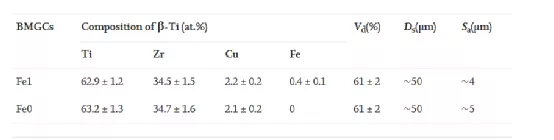 表1 EDS测量了Fe1和Fe0 BMGCs中β-Ti树枝晶的成分、体积分数(Vd)、枝晶跨度(Ds)和二次臂平均尺寸(Sa)。