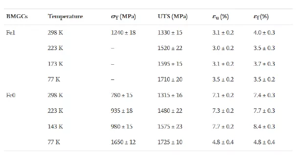表2在不同温度下测试Fe1和Fe0 BMGCs拉伸的屈服强度(σY)、UTS、均匀延伸应变(εu)和断裂应变(εf)。