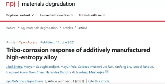 相关研究以题“Tribo-corrosion response of additively manufactured high-entropy alloy”发表在nature子刊npj materials degradation上。