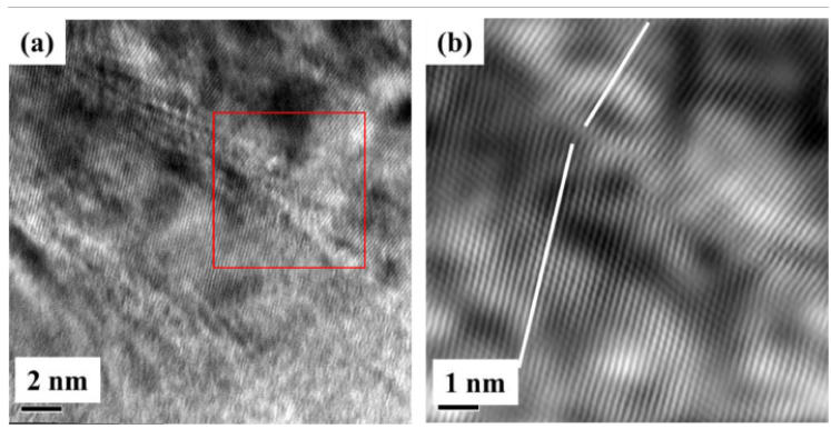 图14 钛钼钢拉伸试样断裂面解理面下方FIB试样的HRTEM显微照片,显示倾斜边界