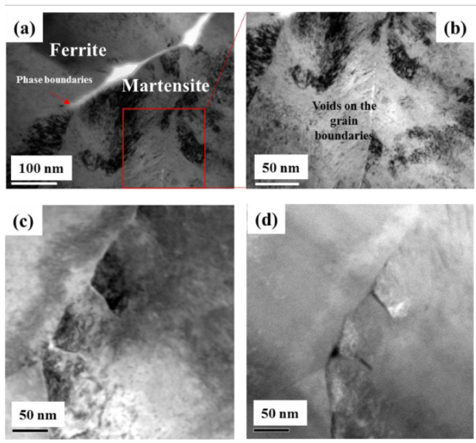 图17 从纤维充氢后,钒钼钢中孔隙的显微照片从存在马氏体的区域的拉伸断裂表面剥离出TEM样品,显示:(a)沿铁素体/马氏体相边界的孔隙;(b)沿着(a)中所示的马氏体板条边界的空隙的TEM亮场图像;(c)和(d)铁氧体三结的STEM明场和暗场图像,显示大量空隙