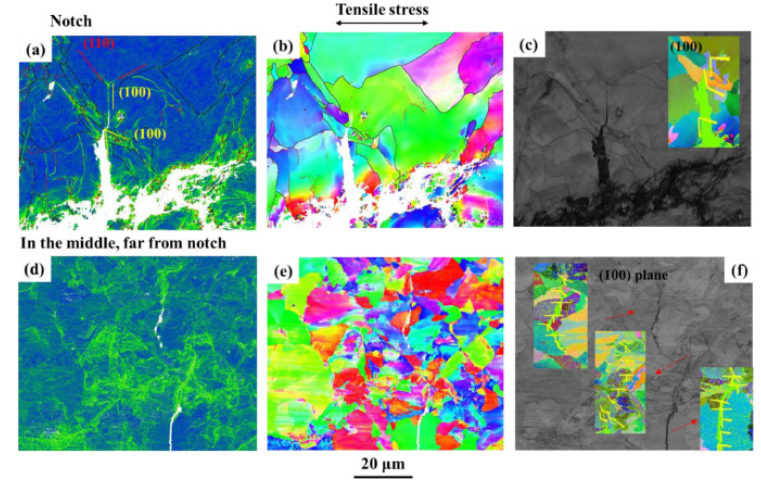 图19 EBSD图显示,裂纹沿(100)面在带电钛钼钢的铁素体晶粒中扩展:(a-c)取自缺口区,(a) KAM图;IPF地图;公元前地图;(d-f)显示远离缺口的二次开裂,在(d) KAM地图上标记有(100)痕迹;IPF地图;(f)公元前地图
