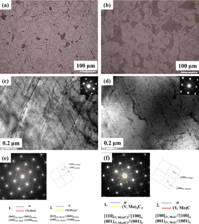 图3 (a,b)取自(a)钛钼钢在630℃等温处理90分钟的样品的光学显微照片;钒钼钢;(c,d)亮场透射电镜显微照片,显示(c)钛钼钢中薄箔样品的相间沉淀;钒钼钢;[001]α显示(钛、钼)碳(更精细)和(钛、钼)存在的衍射图和示意图2c(较粗);[001]α显示(钒、钼)碳(更精细)和(钒、钼)存在的衍射图和示意图四C3(比较粗糙)