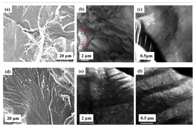 图12 (a-c)钛钼钢和(d-f)钒钼钢带电试样拉伸解理断口的显微组织。(a,d)扫描电镜,显示具有裂纹起始位置的解理断裂表面,从中制备纤维增强复合材料样品;(b)钛钼钢中裂纹起始位置的STEM图像,其中(c)裂纹起始位置的放大图像显示了高位错密度区域和相邻低位错密度区域之间的边界。(e)V-Mo钢中起始位置的STEM图像,显示高位错密度区域和相邻低位错密度区域之间的尖锐边界;(f) STEM图像显示起爆点有裂纹