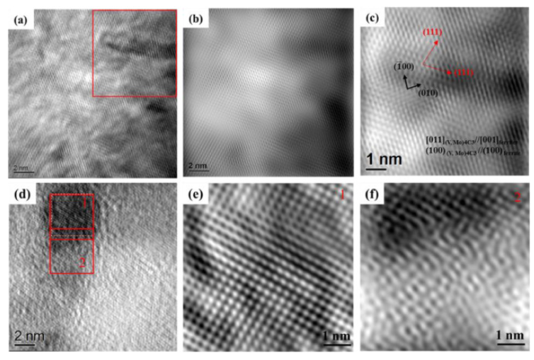 图9 来自不带电(a,b,c)和带电(d,e,f)钛钼钢的相干碳化物的HRTEM图像。(a)碳化物的HRTEM和(b)与(a)相同区域的相关FTT滤波图像;(c)碳化物和铁素体基体界面上的FTT滤波图像;(d)带电样品中碳化物的HRTEM;(e)碳化物的FTT滤波图像;(f)碳化物和铁素体基体界面上的FTT滤波图像