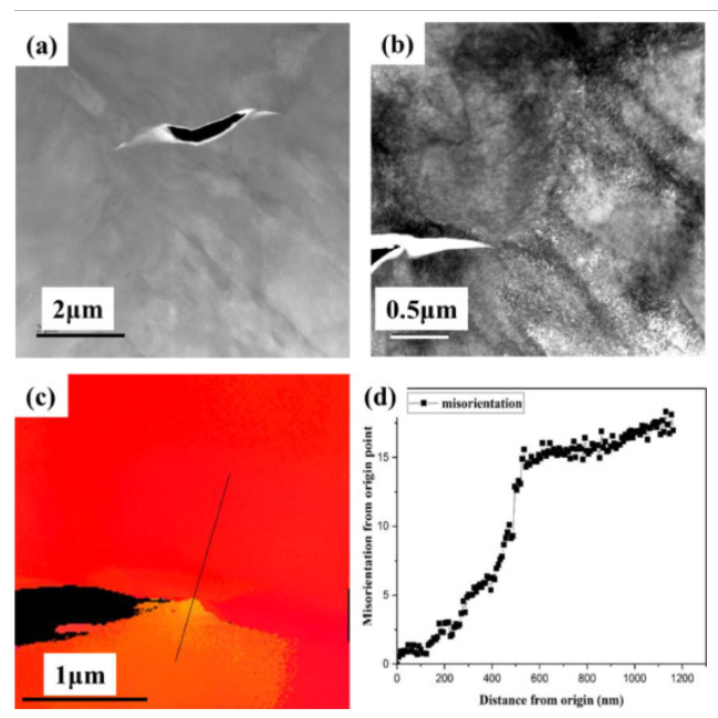 图15 从FIB充氢后钛钼钢中二次裂纹的显微照片在拉伸断裂上剥离TEM样品,显示:(a)显示二次裂纹位置的STEM HAADF低倍放大图像;(b)裂纹尖端一侧的STEM HAADF高倍放大图像,显示裂纹周围的位错结构;裂纹尖端的定向图像;沿着(c)中画出的线的取向错误