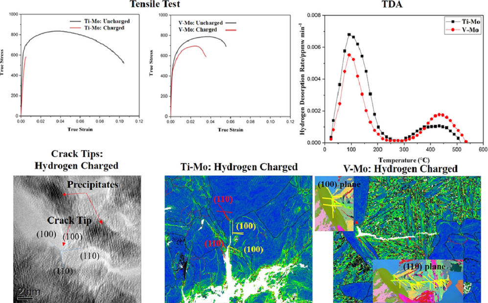 热解吸光谱显示两种钢有两个明显的峰,低温峰与晶界、相界、位错和共格沉淀处的俘获有关,高温峰与半共格沉淀处的俘获有关。 充氢导致钛钼钢严重脆化,在拉伸试验中出现屈服失效。带电拉伸样品中的裂纹起始似乎是由与应变分配相关的位错胞边界处的空洞引起的,符合HELP型机制。