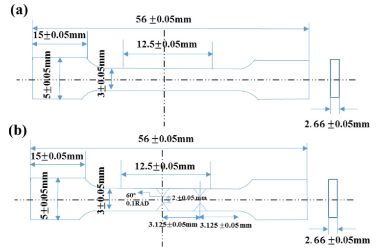 图2 充氢和机械试验中 拉伸样品几何形状(长度单位为毫米):(a)无缺口;(b)有两个缺口