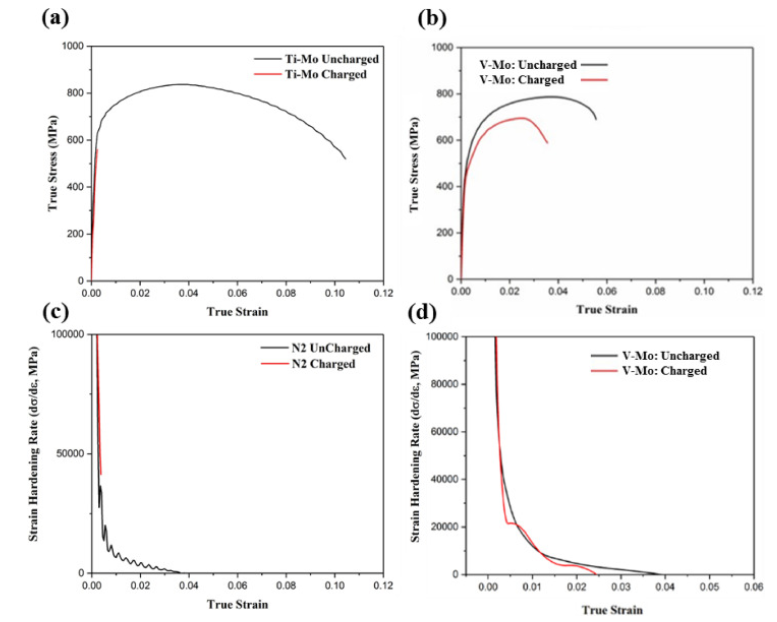 图10 (a,b)工程拉伸应力-应变曲线和(c,d)钛-钼钢(a)和(c)钛-钼钢(b)和(d)钒-钼钢的加工硬化率曲线,不带电和带电拉伸样品在室温下测试失败。充电后(5分钟内)立即进行慢应变率拉伸(SSRT)试验