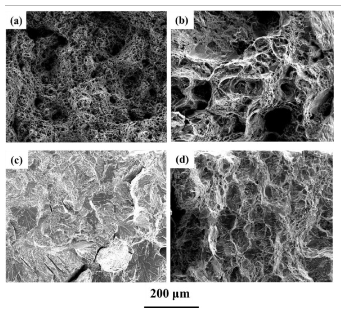图11 钛钼钢在不充氢和充氢时断口的扫描电镜图像;钒钼钢。(a,b)不带电荷的氢和(c,d)带电荷的氢