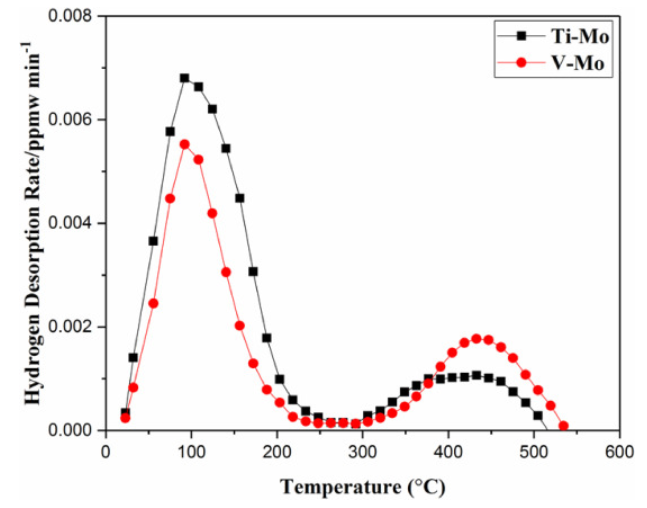 图5 钛钼钢和钒钼钢在100 Ch加热速率下充氢后的热解吸分析光谱?1