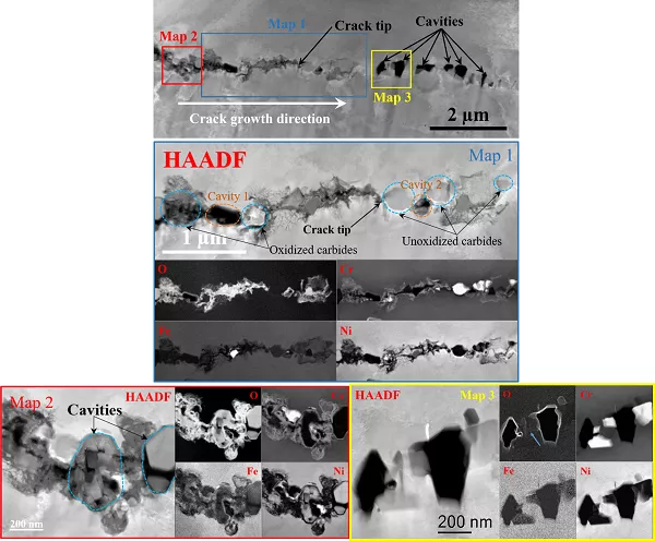 早期核反应堆蒸汽发生器管主要用材是600镍基合金,但其服役经验表明该材料耐应力腐蚀开裂性能较差,在服役一段时间之后出现了大量的应力腐蚀裂纹。同600镍基合金相比,690镍基合金具有更高的Cr含量(~30 wt.%),其在服役过程中表现出及其优异的耐应力腐蚀开裂性能,因此,其已被用来大规模替代600镍基合金作为核反应堆蒸汽发生器管材。截至当前,最早一批690镍基合金已在核反应堆中安全服役30多年,并未在该材料中出现任何一例公开报道的应力腐蚀开裂失效案例,因此,该材料已被广泛的认为具有免疫应力腐蚀开裂的能力。但是,近期日本核安全系统研究所(INSS)以及美国太平洋西北国家实验(PNNL)的研究发现,690镍基合金在经过超长时间的应力腐蚀开裂实验之后(>20000h),其晶界出现了大量的纳米孔洞。这些学者猜测这些沿晶纳米孔洞能够降低材料的强度,促进应力腐蚀裂纹的生长。但是,由于应力腐蚀开裂是个极其复杂的过程,影响因素众多,对于690镍基合金中沿晶纳米孔洞的形成机制,以及其与应力腐蚀裂纹之间的关系都尚不清楚。