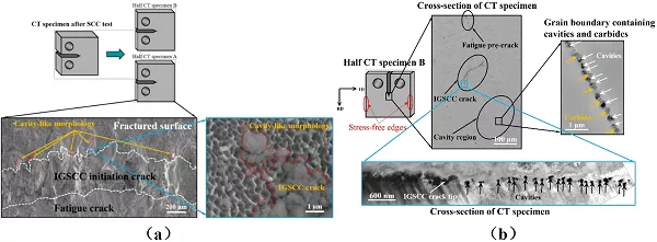 图 1:690镍基合金实验结束后其裂纹形貌:(a)断口形貌;(b)截面形貌。