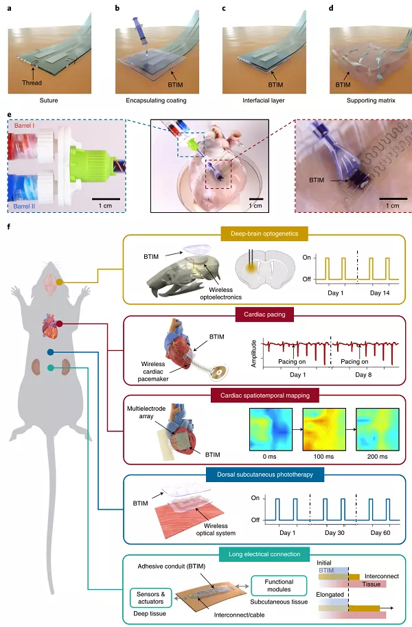 灵活的电子/光电系统可以紧密地集成到重要器官系统的表面,有潜力提供与广泛的疾病和紊乱相关的革命性诊断和治疗能力。这些技术与活体组织之间的关键界面必须提供软机械耦合和有效的光/电/化学交换。美国西北大学John A. Rogers、Yevgenia Kozorovitskiy联合乔治华盛顿大学Igor R. Efimov等人介绍了一种功能性粘附生物电子-组织界面材料,其形式为机械顺应性、导电性和光学透明封装涂层、界面层或支撑基体。这些材料与设备表面和不同内部器官的表面紧密结合,在几天到几个月的时间内具有稳定的粘附性,可以以可控的速率量身定制生物吸收。活体动物模型的实验演示包括设备应用,从用于脑深部光遗传学和真皮下光疗的无电池光电系统到无线毫米级起搏器和柔性多极心外膜阵列。这些进展可以立即应用于目前用于动物模型研究的几乎所有类型的生物电子/光电系统,它们也有潜力在未来治疗危及生命的疾病和紊乱。相关研究以“Photocurable bioresorbable adhesives as functional interfaces between flexible bioelectronic devices and soft biological tissues”为题目,发表在Nature Materials上。