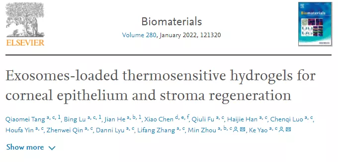 浙江大学眼科医院姚克教授、浙江大学转化医学院周民研究员等团队开发了一种新的方法,基于诱导多能干细胞衍生间充质干细胞(iPSC-MSCs)的外泌体,结合热敏水凝胶,用于治疗角膜创伤。研究发现,热敏壳聚糖水凝胶(CHI水凝胶)缓释iPSC-MSC外泌体可以有效地促进受损的角膜上皮和基质层修复,下调胶原蛋白在角膜基质的表达,减少疤痕的形成。该研究为目前临床角膜疾病提供新的治疗方式,具有极大的临床应用及转化可能。研究成果以“Exosomes-loaded thermosensitive hydrogels for corneal epithelium and stroma regeneration”为题发表于Biomaterials。
