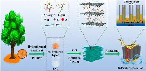 频繁的石油泄漏、不溶于水的有机溶剂泄漏以及工业含油废水排放的增加,都造成水污染、生态系统失衡和许多自然灾害。全球对油污净化的需求需要开发低成本、高效率的可靠且灵活的材料和技术。在众多的材料和技术中,吸附剂由于操作简单、回收油分效率高、环保等优点,被认为是油污净化的有前景的候选材料。华南理工大学陈克复院士、曾劲松教授等研究团队提出了一种新策略来有效地制造3D弹性还原氧化石墨烯(RGO)交联碳气凝胶。值得注意的是,从植物纸浆中分离出的纤维素纳米晶体(CNCs)是必不可少的成分,而植物纸浆过程中的工业副产品预水解液(PHL)作为粘合促进剂,实现了碳气凝胶强度和柔韧性的增强。 这是第一次充分利用树的所有成分(纸浆和PHL)来设计碳气凝胶。具有跳板弹性支撑微结构的波浪状碳层的形成能够实现机械拉伸和收缩,并避免压缩过程中的界面塌陷。得益于独特的波浪层结构和强相互作用,碳气凝胶超轻(4.98 mg cm–3 ) 并表现出超压缩(承受95%的极端应变)和超弹性(在50%的应变下500次循环后保持约100%的高度)。特别是碳气凝胶可以选择性、快速地吸附各种油性污染物,表现出较高的油/有机溶剂吸收能力(对四氯化碳可达276 g g–1)和良好的可回收性。最后,展示了碳气凝胶在石油净化和污染修复设备中的实际应用。因此,这种多功能且坚固的功能化碳气凝胶在石油净化和污染修复方面具有广阔的潜力。研究成果以“Mechanically Flexible Carbon Aerogel with Wavy Layers and Springboard Elastic Supporting Structure for Selective Oil/Organic Solvent Recovery”为题发表于ACS Applied Materials & Interfaces。