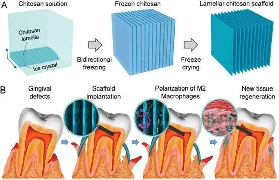 黏龈手术已成为牙科临床实践中软牙龈组织修复的常见手术,主要依赖于自体移植或商业胶原膜(CM)。然而,自体移植物在来源可用性和长期术后疼痛管理方面面临巨大挑战,而CM在水性环境中受到其较差的机械性能的限制。俞书宏课题组通过双向冷冻方法制造的具有长程有序多孔结构的仿生层状壳聚糖支架(LCS)作为一种有前途的牙龈组织工程材料。LCS不仅在水合状态下表现出优异的机械性能,而且在体内加速血管形成和软组织再生。最有趣的是,发现LCS能够诱导巨噬细胞分化为M2巨噬细胞,这被认为在组织再生中起重要作用。这些优势与其简单且低成本的制备过程相结合,使LCS成为牙科临床应用的有希望的候选者。相关研究以“Biomimetic Lamellar Chitosan Scaffold for Soft Gingival Tissue Regeneration”为题目,发表在AFM上。