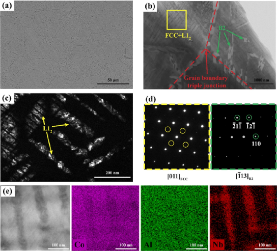 图1 (a) Co-10Al-3Nb合金在700°C下时效168小时后的背散射电子显微图。(b)放大的晶界三联结区域的TEM显微图。代表性的“FCC+L12”双相区以黄色突出显示。如绿色箭头所示,B2型CoAl相可以沿晶界和晶粒内部找到。(c) 暗场TEM图像显示了排列良好的L12粒子。(d) 衍射图显示基体相的[011]区轴较长,B2型CoAl相的[1?13]区轴较长。L12超晶格点以黄色圆圈突出显示。(e) “FCC+L12”双相区的EDS图,显示Nb与L12颗粒之间存在强烈的分离。
