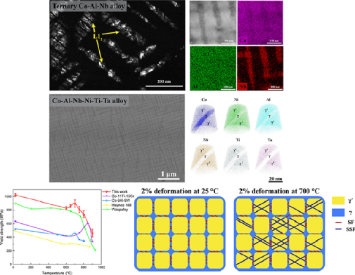 3) 新开发的多组分富Co合金在环境温度和高温下均表现出优异的强度,分别在25 °C和700 °C下达到1023±27 MPa和897±53 MPa。在整个温度范围内,富钴合金的强度甚至优于商用镍基高温合金Waspaloy。值得注意的是,在室温下变形时,纳米尺度的层错被几何限制在基体通道中,并作为主要的塑性载体。低层错能量矩阵和窄矩阵通道有望促进基体通道中高密度层错的形成。室温下没有颗粒剪切是由于多组分γ′沉淀的超高平面断裂能以及由此产生的对基体位错的高剪切阻力。在700 °C下应变后,观察到超晶格层错基粒子剪切的激活,其相互作用是该温度下屈服异常的原因。