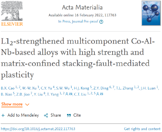香港城大刘锦川院士团队金属顶刊《Acta 》创新设计室温和高温均具有高强度的 L12 强化 Co-Al-Nb 基合金!