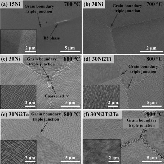 图4 (a)Co-15Ni-10Al-3Nb(15Ni)和(b)Co-30Ni-10Al-3Nb(30Ni)合金在700 °C下时效168小时后晶界三联区的代表性SEM显微照片。在15Ni合金的晶界处观察到微量B2相,而30Ni合金中保持了干净的γ-γ′双相显微结构。800℃时效168小时后,(c)Co-10Al3Nb-30Ni(30Ni),(d)Co-10Al-3Nb-30Ni-2Ti(30Ni2Ti),(e)Co-10Al-3Nb-30Ni-2Ta(30Ni2Ta)和(f)Co-10Al-3Nb-30Ni-2Ti-2Ta(30Ni2Ti)合金晶界三连接区的代表性SEM显微图。放大的晶粒内部显微图显示在相应的插图中。