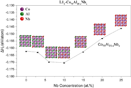 图12 L12型Co3(Al,Nb)相的焓生成能是Nb浓度(0,3,6,10,15,20,25 at.%)的函数。