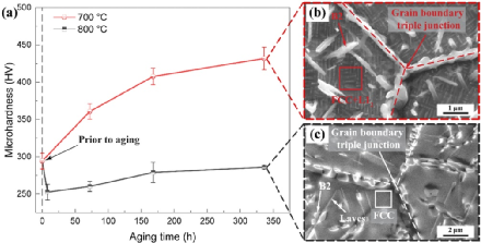 图3 (a) Co-10Al-3Nb三元合金分别在700 ℃和800 ℃时效的时间显微硬度演变。(b) Co-10Al-3Nb合金在700 °C下时效336小时后的SEM显微照片显示,在整个γ-Co基体以及块状B2相中形成了纳米级L12型沉淀。(c) Co-10Al-3Nb合金在800 ℃下时效336小时后的SEM图像。随着时效温度升高至800°c,γ′-Co3(Al,Nb)相消失并转变为Laves相。