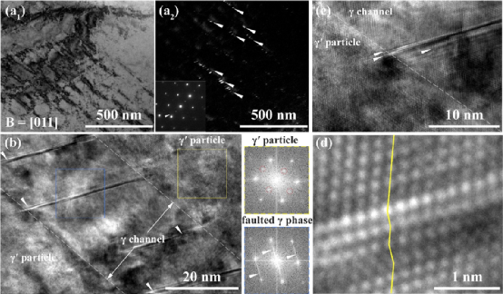 图9(a) 30Ni2Ti2Ta合金在室温下约2%塑性变形后的TEM亮场(BF)和暗场(DF)显微照片。高密度γ′沉淀被窄的基体通道分离。相应衍射图(插图)中的弱条纹线(由白色箭头突出显示)表明存在层错。利用条纹线拍摄DF显微照片,这些条纹线照亮了许多基体通道限制的层错。(b) 高分辨率TEM(HRTEM)图像显示了基质约束层错的近景。还显示了从γ′粒子(黄色方块)和含有层错的γ矩阵通道(蓝色方块)获得的快速傅里叶变换(FFT)衍射图。超晶格斑点用红色圆圈突出显示,表明γ′粒子的有序性质。在故障γ矩阵相位的FFT中可以发现条纹线(如白色箭头所示),这也证实了矩阵通道之间存在层错。(c) 典型的HRTEM图像显示,层错通过部分位错扩展受到γ′沉淀的阻碍,并在γ/γ′界面处停止。(d) 显示层错区原子结构的HRTEM显微照片。