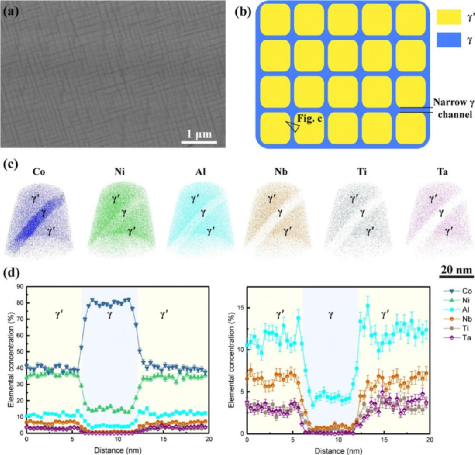 图7 (a) 30Ni2Ti2Ta合金的SEM显微照片和(b)相应的示意图,表明高密度的γ′沉淀将γ相分为纳米级通道。(c)APT重建纳米尖端的离子图。(d)γ/γ′界面上的邻近直方图,显示了γ相和γ′相之间明显不同的元素组成。