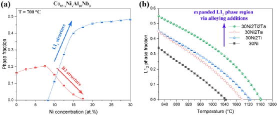 图13(a) 在Co-10Al-3Nb-xNi合金中,L12结构和B2结构的相分数是镍浓度的函数。(b) Ti和Ta合金化Co-10Al-3Nb-30Ni基合金中L12相分数随温度的变化。