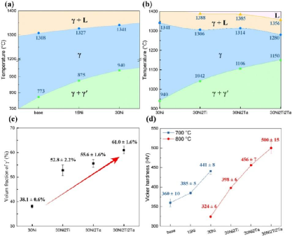 图5 (a) 基体、15Ni和30Ni合金的γ′-固溶体和γ-固相线温度。(b) 30Ni、30Ni2Ti、30Ni2Ta和30Ni2Ti2Ta合金的γ′-溶质、γ-固相线和液相线温度。(c) 800 ℃时Co-Al-Nb基合金中γ′相的体积分数。(d)Co-Al-Nb基合金在700 ℃和800 ℃时效168 h后的显微硬度演变。