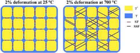图11 25°C和700°C下变形子结构示意图。缩写:SF,层错;SSF,超晶格层错