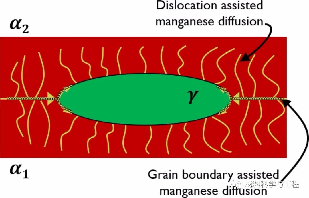 图3 通过晶界/相界和位错的锰扩散路径示意图。