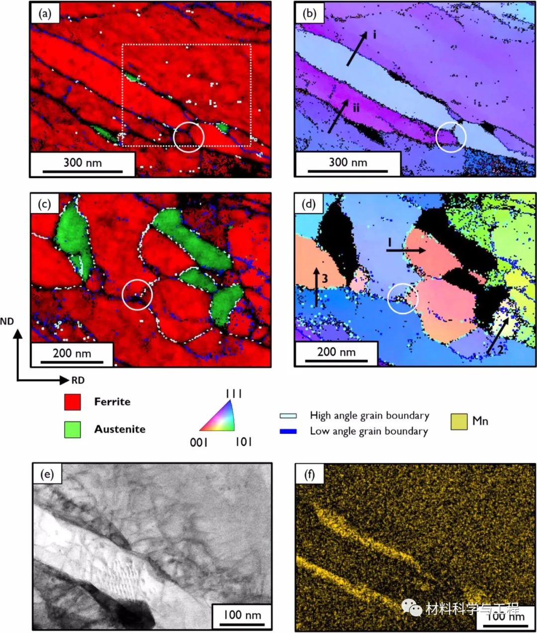 众所周知,材料中晶界(GB)和位错可以作为快速扩散通道。这些通道对中锰钢(3-12wt.% Mn)临界退火期间奥氏体的生长具有直接影响。最近的研究揭示了锰向铁素体GBs的偏析是退火过程中奥氏体形核的重要途径。奥氏体生长是通过奥氏体铁素体相界向铁素体移动来实现的。一般情况下,奥氏体在相界处的平衡锰浓度大于铁素体。奥氏体生长的动力学是由锰在铁素体中的扩散速率决定的,由于临界退火温度通常≤0.5Tmelt,在bcc铁素体中,体扩散也非常缓慢,推断GB和位错在溶质迁移中发挥关键作用。然而,这些快速通道在奥氏体生长中的作用机制还不够清晰。